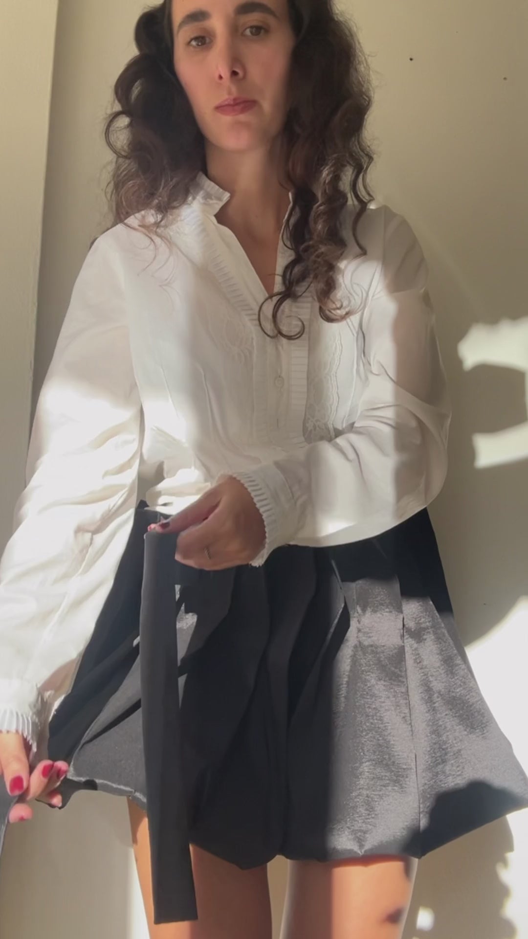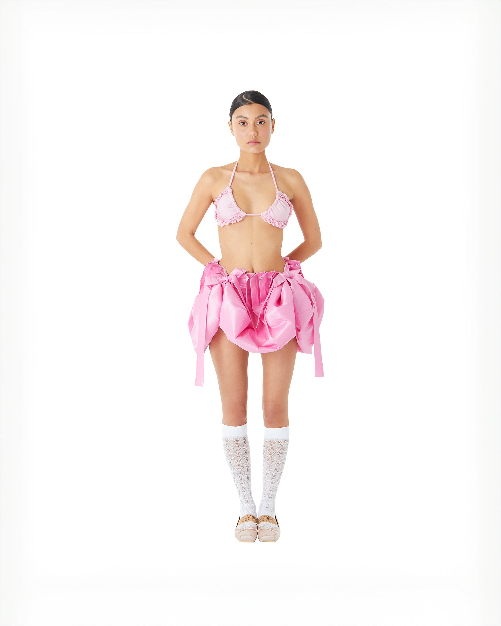 A set of pleats surrounds the hips generating a very interesting volumetric structure. You can also transform it, as it comes with two straps as an accessory that you can use to shorten it or create new shapes. You will always have a different skirt.