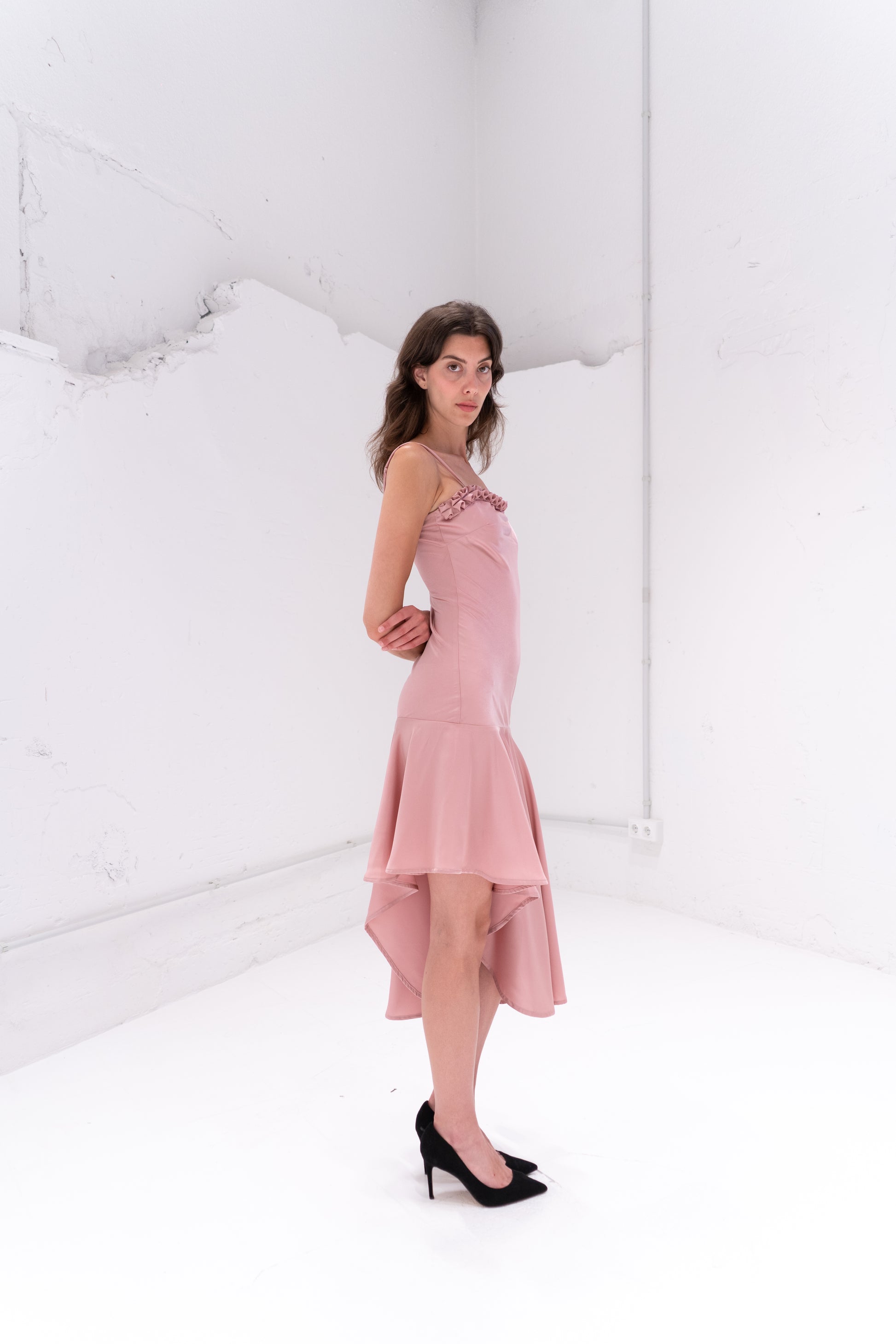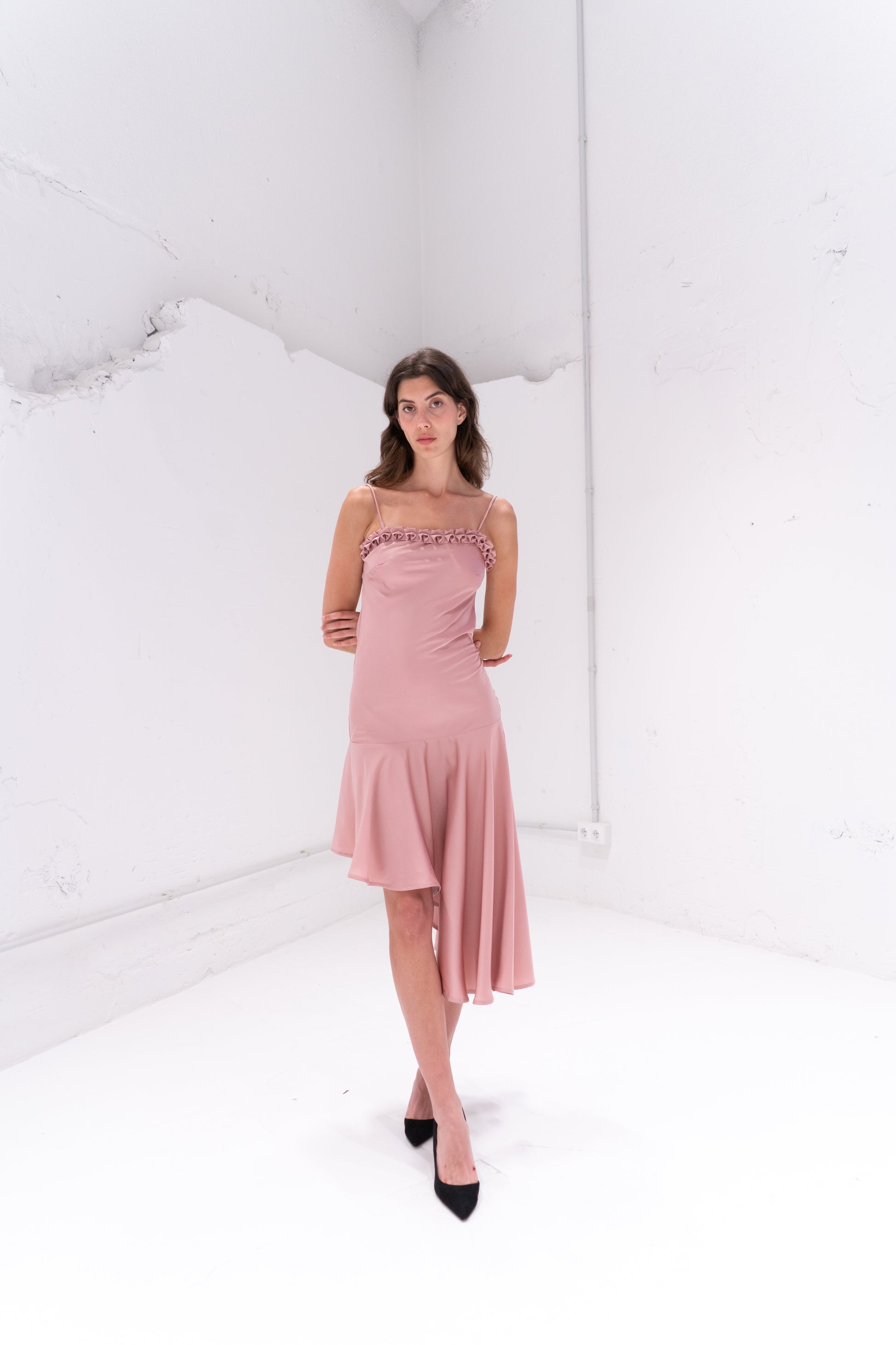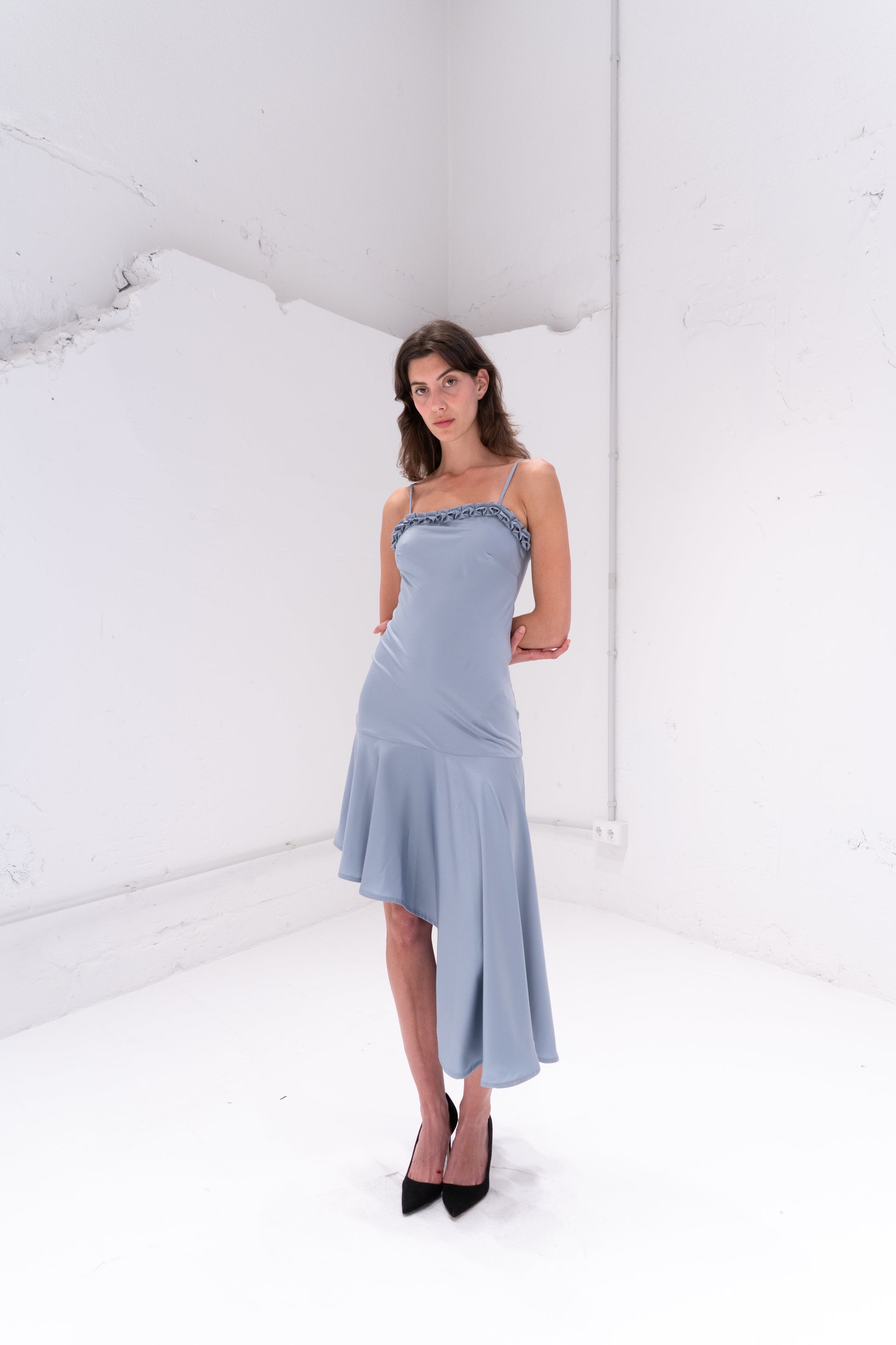 This exclusive deluxe shoulder-strap dress is made of fine silver gary gauze. The top is contoured by a mirrored double-pleated ribbon. The dress length ends in a slight and subtle flounce.